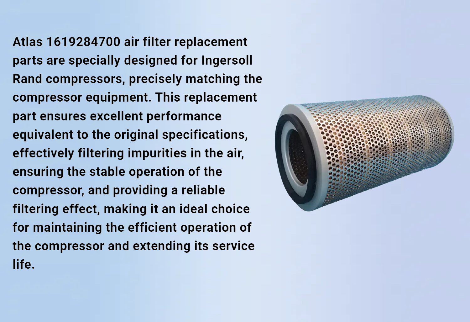 Atlas 1619284700 air filter replacement parts are specially designed for Ingersoll Rand compressors, precisely matching the compressor equipment. This replacement part ensures excellent performance equivalent to the original specifications, effectively filtering impurities in the air, ensuring the stable operation of the compressor, and providing a reliable filtering effect, making it an ideal choice for maintaining the efficient operation of the compressor and extending its service life.