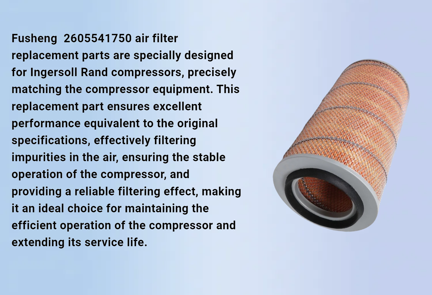 Fusheng 2605541750 air filter replacement parts are specially designed for Ingersoll Rand compressors, precisely matching the compressor equipment. This replacement part ensures excellent performance equivalent to the original specifications, effectively filtering impurities in the air, ensuring the stable operation of the compressor, and providing a reliable filtering effect, making it an ideal choice for maintaining the efficient operation of the compressor and extending its service life.