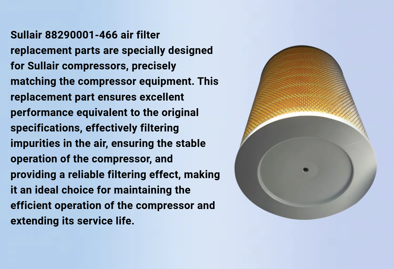 Sullair 88290001-466 air filter replacement parts are specially designed for Sullair compressors, precisely matching the compressor equipment. This replacement part ensures excellent performance equivalent to the original specifications, effectively filtering impurities in the air, ensuring the stable operation of the compressor, and providing a reliable filtering effect, making it an ideal choice for maintaining the efficient operation of the compressor and extending its service life.